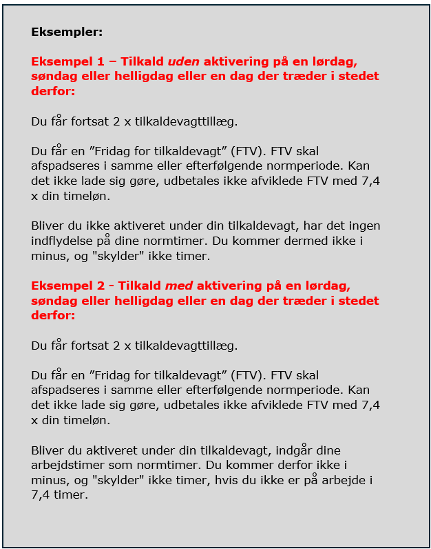 Har du tilkaldevagt på lørdage, søn- og helligdage samt dage, der træder i stedet derfor, får du en ”fridag for tilkaldevagt” (FVT) ud over dit tilkaldevagttillæg.