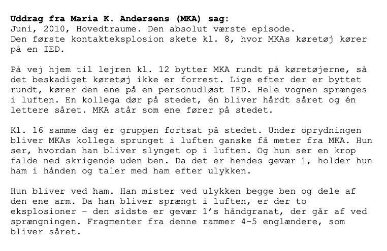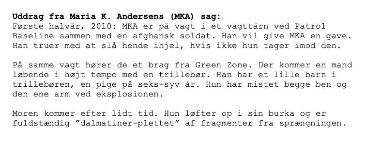 Artiklen er baseret på interviews med Maria K. Andersen og CS’ advokat, Mette Lind-Hansen, privatbilleder, Marias sag og Arbejdsmarkedets Erhvervssikrings afgørelse samt Forsvarets webartikel om ISAF Hold 9. Uddrag fra Maria K. Andersens sag gengives i artiklen med hendes godkendelse.