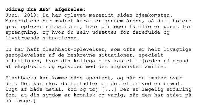– Hele læringen var jo også at få fortalt min sag stærkest muligt til Arbejdsmarkedets Erhvervssikring, så jeg ikke undlod noget. For den eneste, der kunne blive straffet for at udelade detaljer, var jo mig; hvis jeg sagde til mig selv, at det også er meget normalt at se folk dø. Jo, det er det måske i en krigszone, men derfor kan det godt påvirke én. Det bliver en normalitet for én, og at det, at jeg har det svært, er bare the new normal. Sådan kunne jeg tænke.