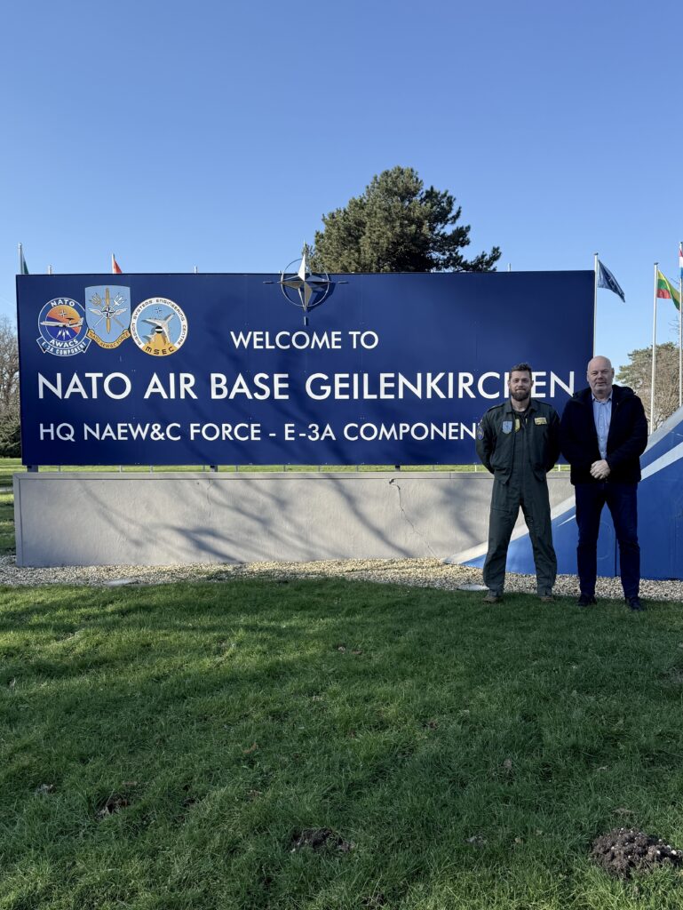CS næstformand Ronni Pedersen har sammen med medlemskonsulent Arne Elvis Fuglsang taget turen til NATO Air Base Geilenkirchen for at møde udstationerede CS-medlemmer, der udgør halvdelen af flybasens dansker-koloni. De bliver mødt af seniorsergent Simon, der er tillidsrepræsentant og ligesom de fleste andre danskere arbejder som crew på basens 14 AWACS-fly.