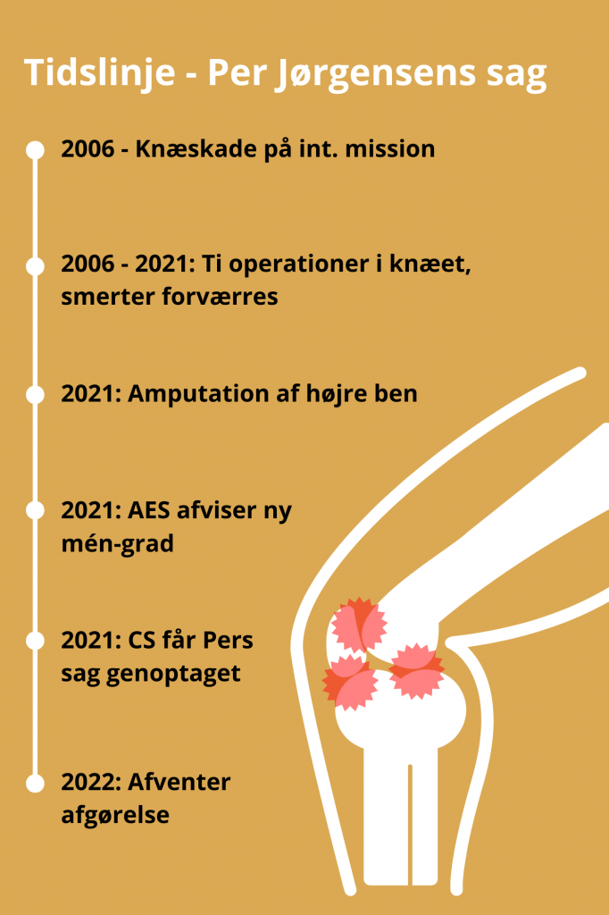 Per Jørgensens arbejdsskadesag begyndte med en knæskade i Irak i 2006 og kulminerede med en benamputation sidste sommer. Nu venter han og CS på, at myndighederne revurderer hans mén-grad, der stadig ligger på kun otte procent.