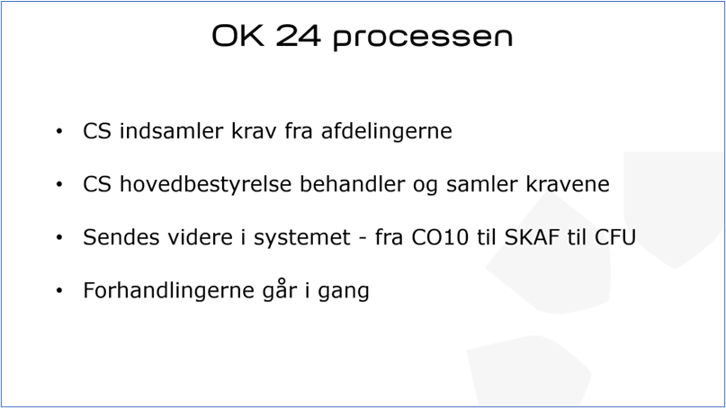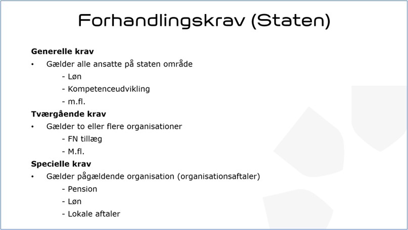 Først forhandler man de generelle krav for hele staten. Det kan for eksempel være krav om seniorer, kompetenceudvikling mv. Herefter er der fire uger, hvor organisationerne kan forhandle specielle krav med arbejdsgiver.